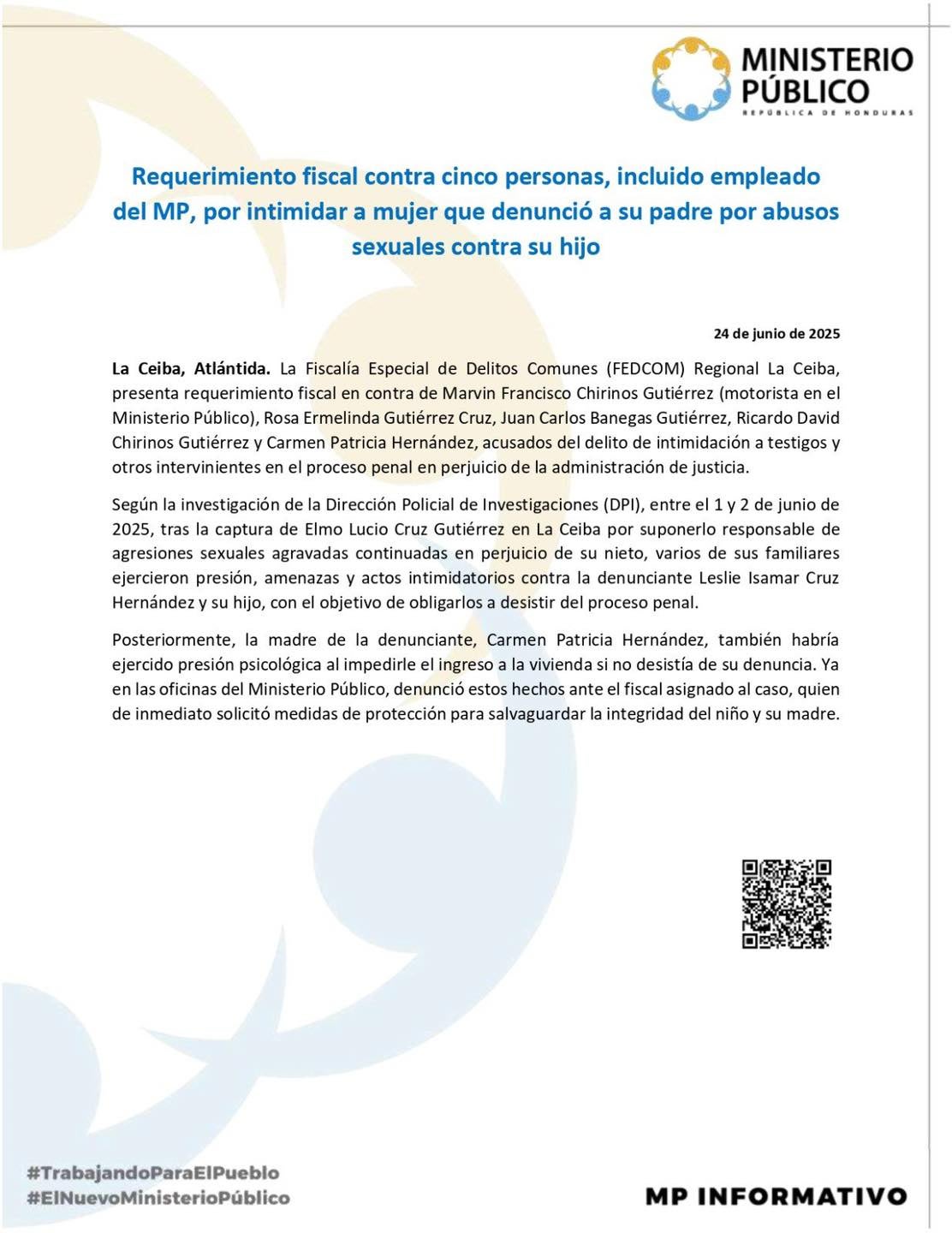 Redacción. El Ministerio Público (MP) informó en las últimas horas que giró un requerimiento fiscal en contra de cinco personas, incluyendo un empleado de la misma dependencia debido a intimidaciones a una mujer que interpuso una denuncia.