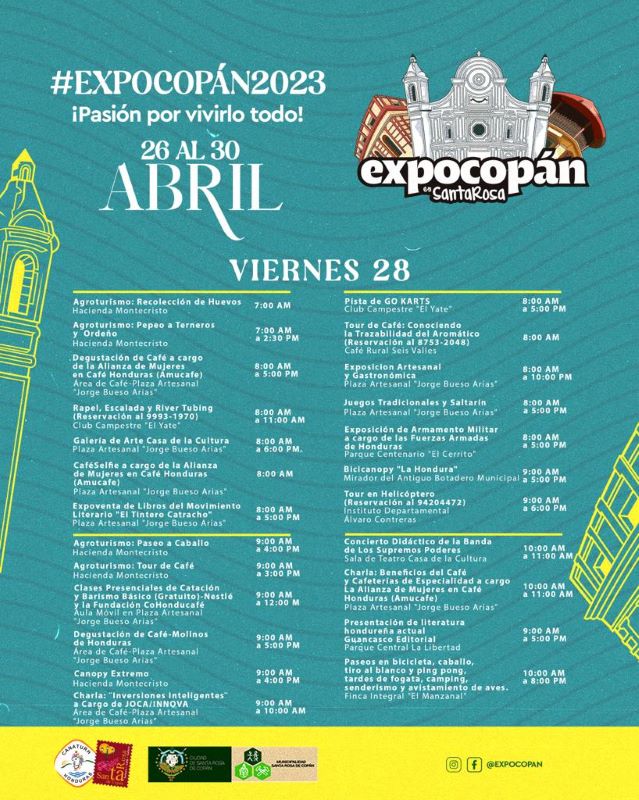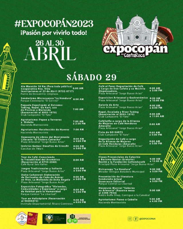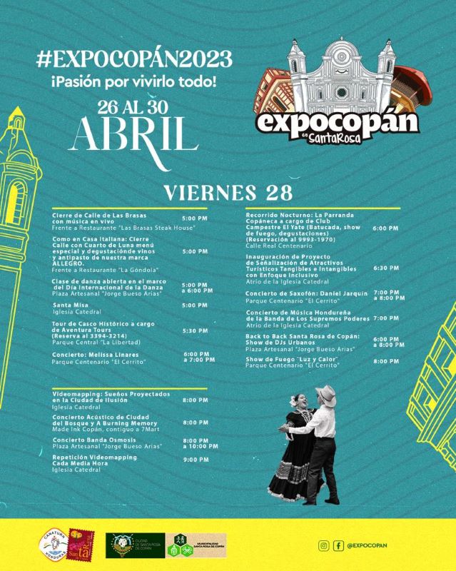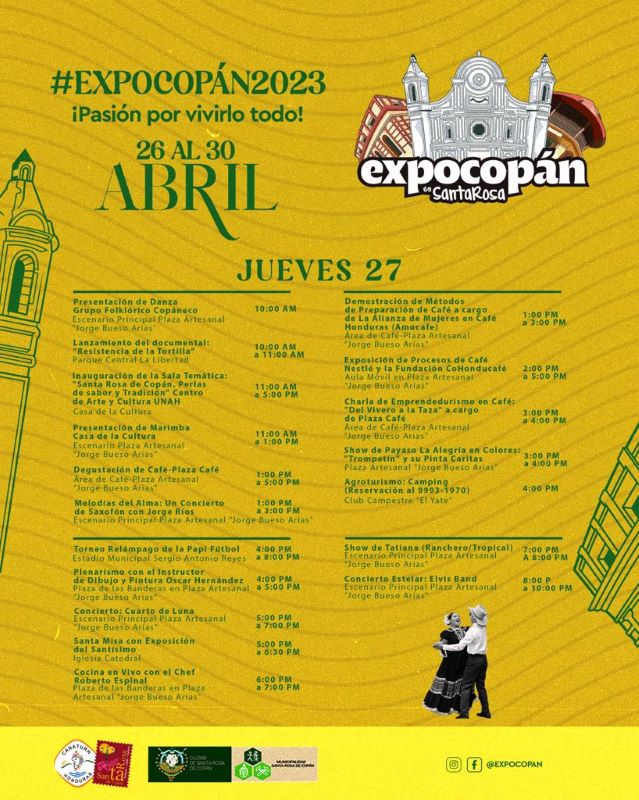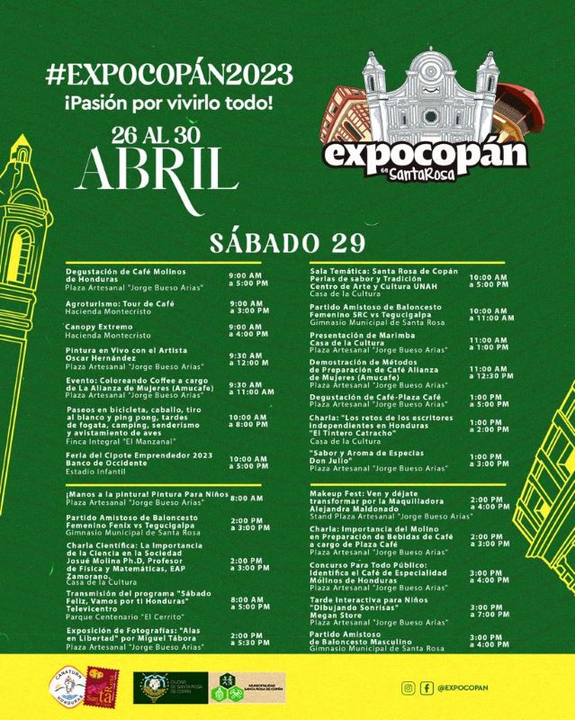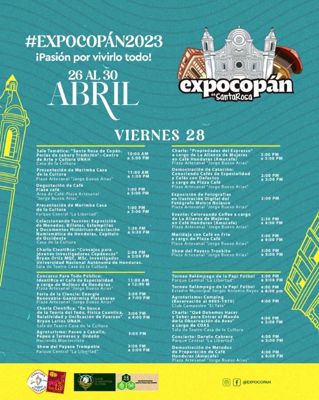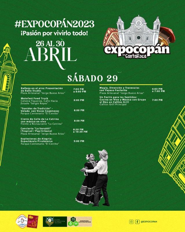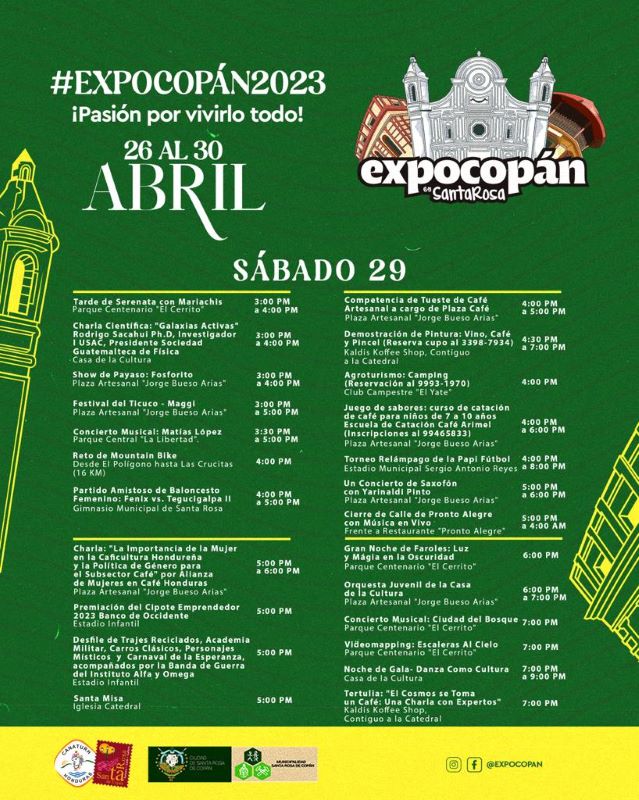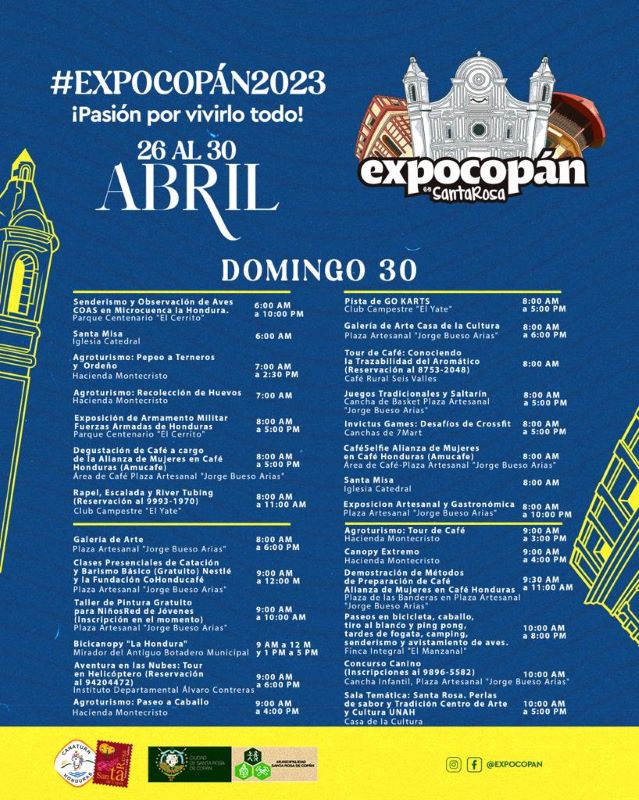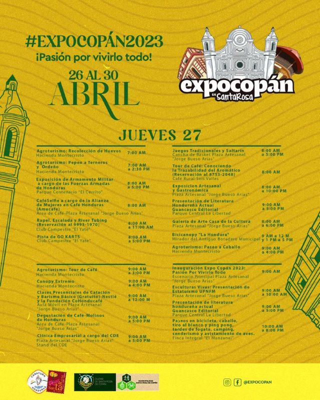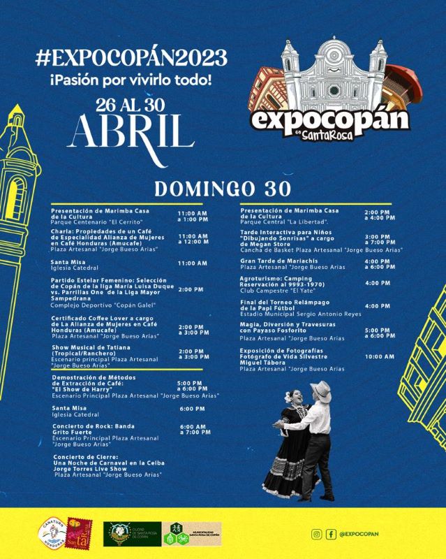 Asimismo, el cierre será el domingo 30 de abril en horas de la noche, y habrán muchas actividades en marco de la clausura. A continuación, Diario Tiempo le presenta el cronograma de ExpoCopán 2023, para que visite Santa Rosa de Copán esta semana.