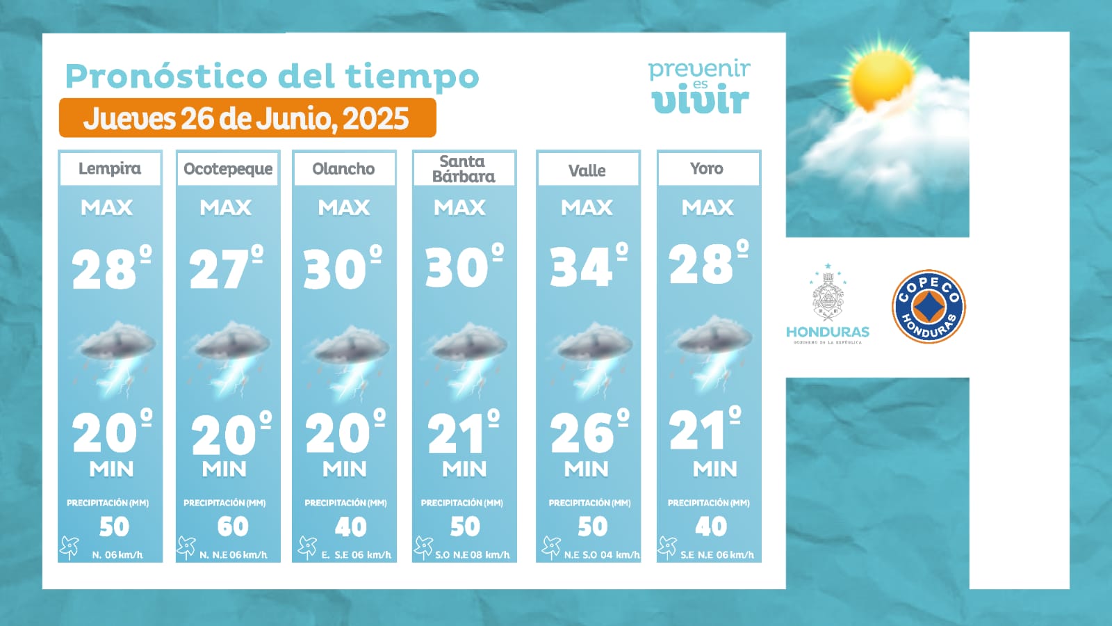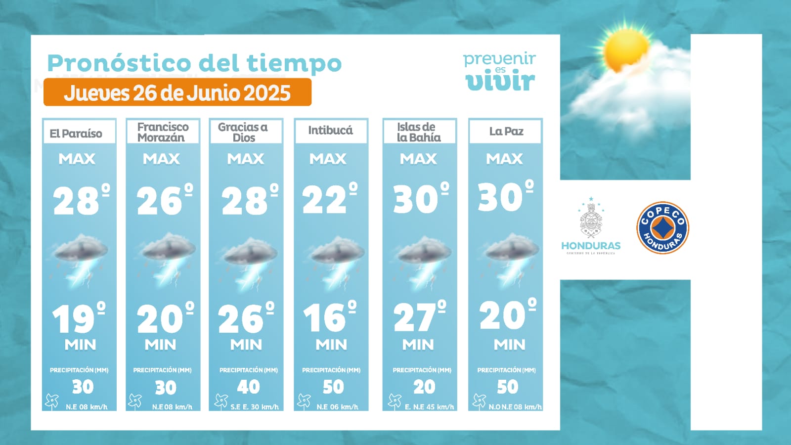 Redacción. Para este jueves 26 de junio de 2025, el Centro Nacional de Estudios Atmosféricos, Oceanográficos y Sísmicos (Cenaos) pronosticó lluvias en la mayor parte de Honduras.