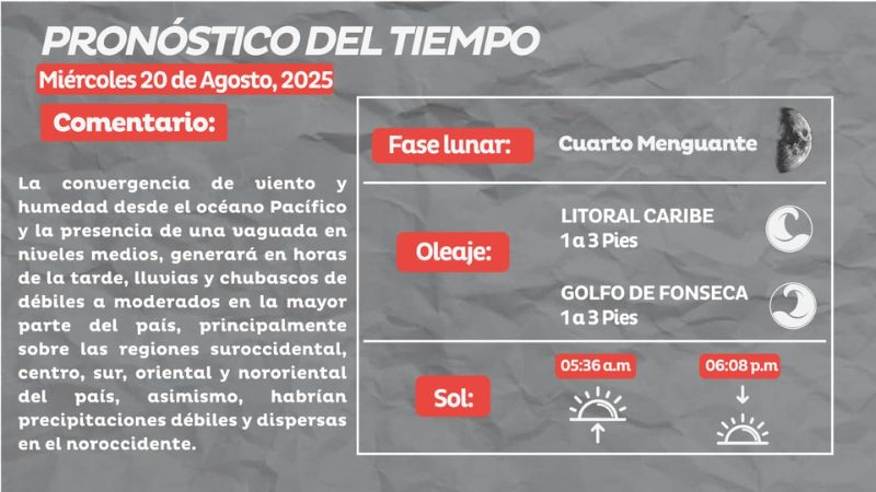 Clima. El Centro Nacional de Estudios Atmosféricos, Oceanográficos y Sísmicos (Cenaos) informó, a través de sus canales oficiales, el pronóstico del tiempo para este miércoles 20 de agosto de 2025.