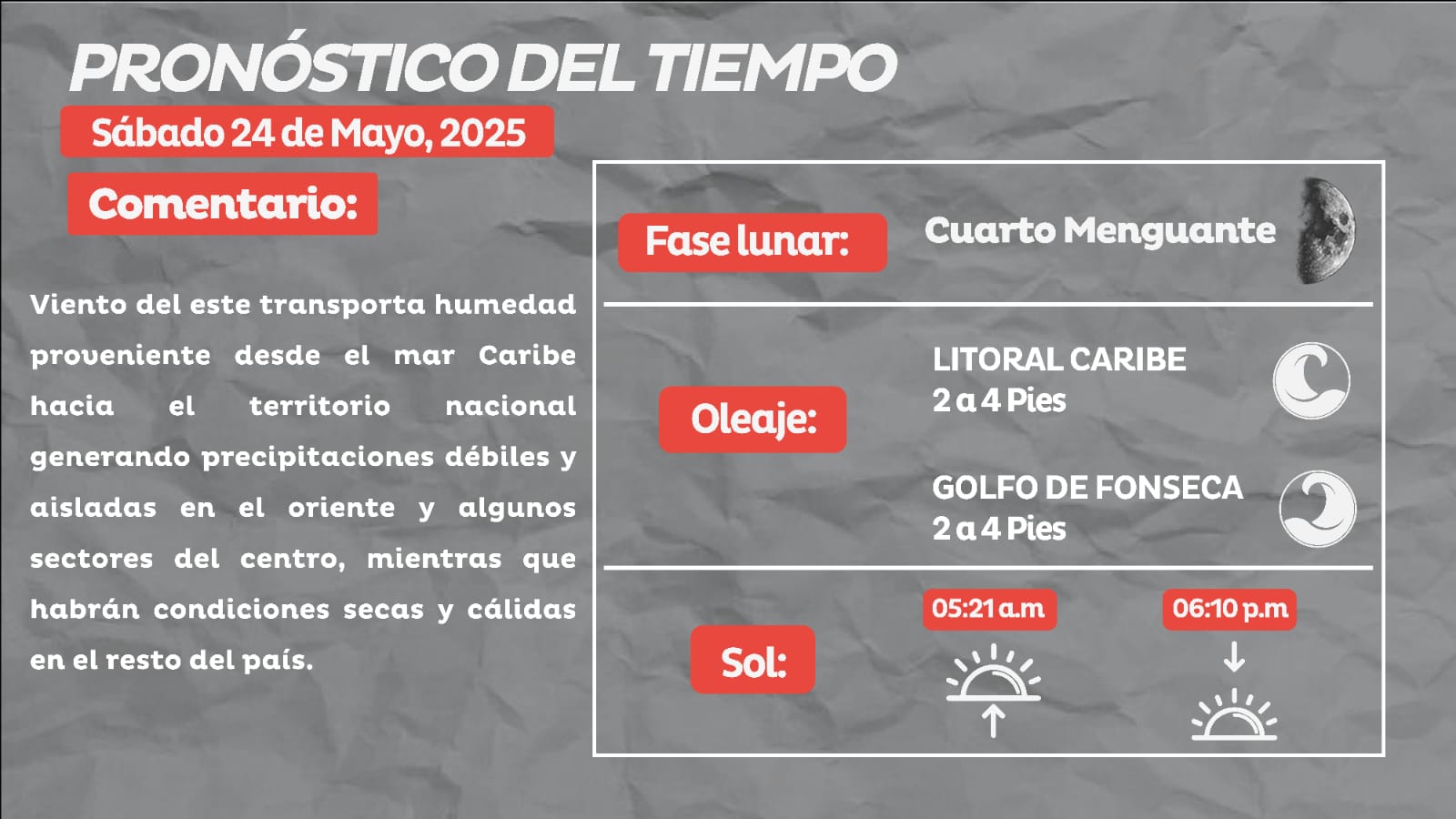 Redacción. El Centro Nacional de Estudios Atmosféricos, Oceanográficos y Sísmicos (Cenaos) informó el pronóstico del clima para este sábado 24 de mayo de 2025.
