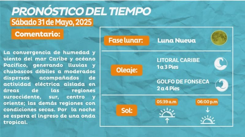 Clima. El Centro Nacional de Estudios Atmosféricos, Oceanográficos y Sísmicos (Cenaos) dio a conocer el pronóstico del clima para este sábado, 31 de mayo de 2025, a través de sus canales oficiales.
