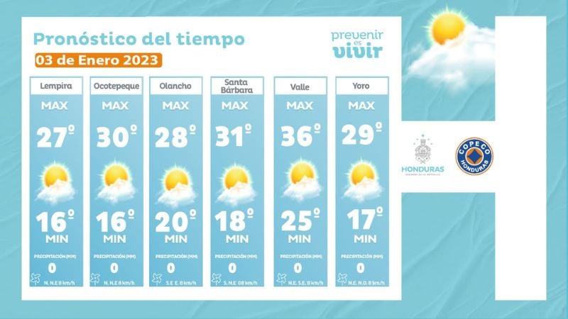 - Tegucigalpa: 27° como máximo, 13° como mínimas (0 milímetros)
