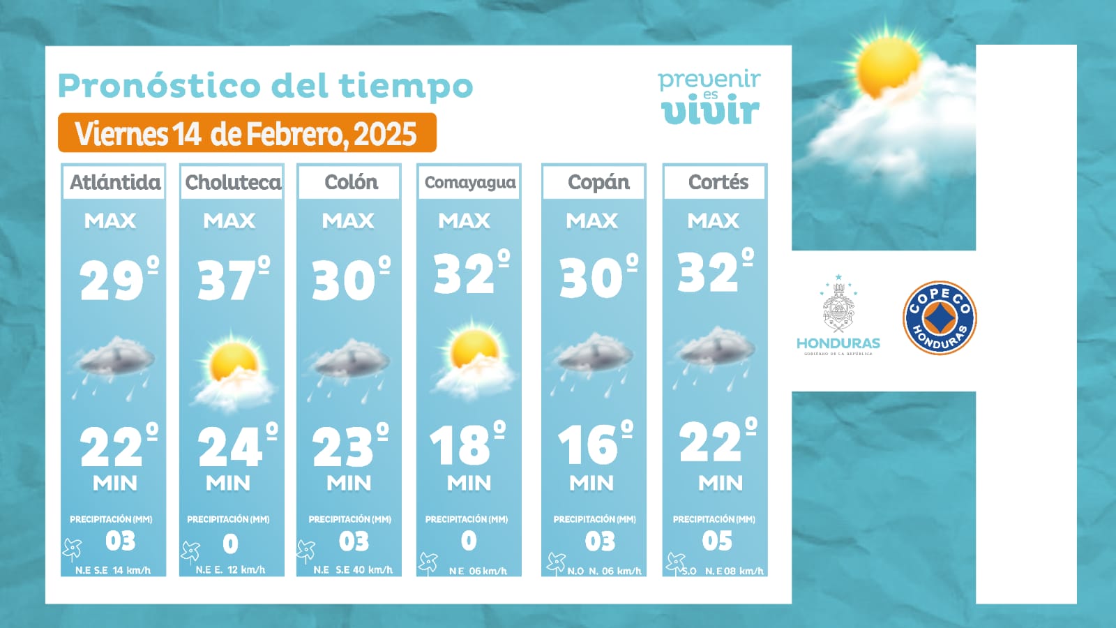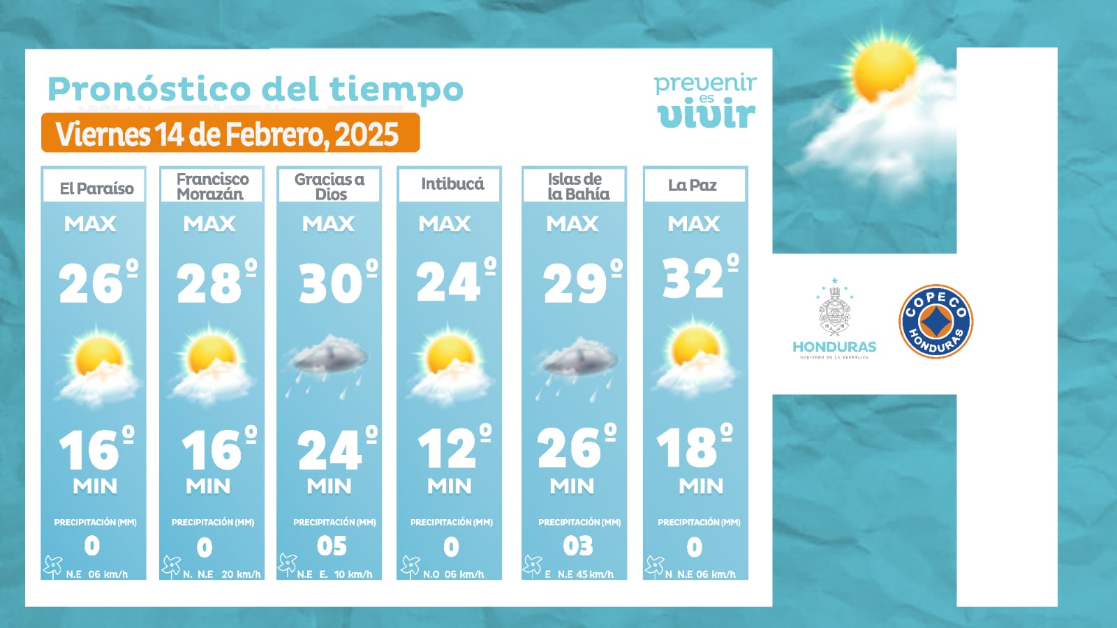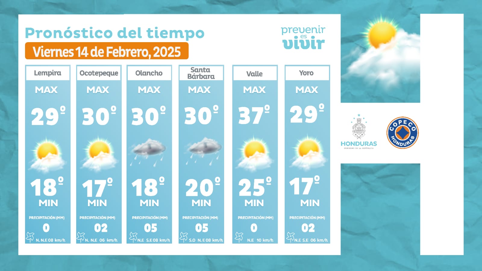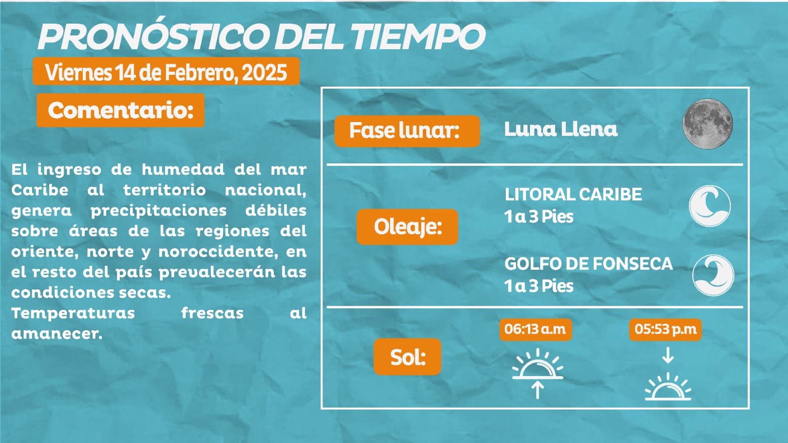 Clima. El Centro Nacional de Estudios Atmosféricos, Oceanográficos y Sísmicos (Cenaos) informó que este viernes 14 de febrero se espera un clima inestable, con condiciones secas en varias zonas de Honduras y lluvias leves en algunas regiones.