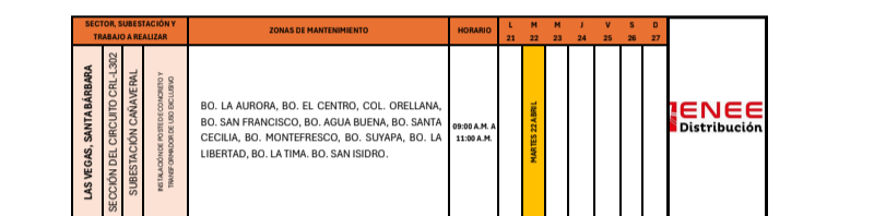 Redacción. Varias zonas del departamento de Santa Bárbara serán afectadas con los cortes de energía programados por la Empresa Nacional de Energía Eléctrica (ENEE) para este martes 22 de abril de 2025.