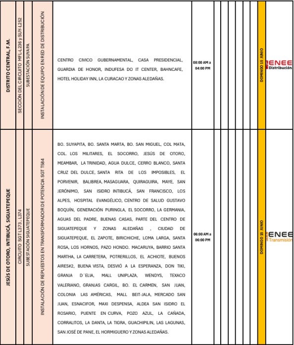 Por su parte, en Siguatepeque, departamento de Comayagua, los sectores de El Achiote, Buena Vista, La Cañada y áreas circunvecinas también serán objeto de suspensión eléctrica en el mismo horario: de 06:00 a.m. a 06:00 p.m.