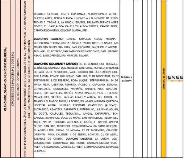 En el norte del país, los municipios de Olanchito y El Arenal, en el departamento de Yoro, así como algunas zonas del departamento de Olancho, estarán sin suministro eléctrico desde las 08:30 a.m. hasta las 04:30 p.m.