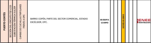 Por su parte, en Puerto Cortés (Cortés), la interrupción del servicio eléctrico está programada desde las 8:00 de la mañana hasta el mediodía.