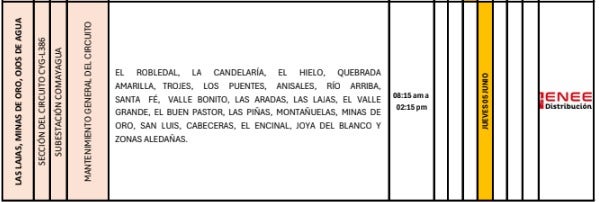 De acuerdo con la información brindada por la estatal, en el departamento de Comayagua, los sectores afectados serán El Hielo, Los Puentes, Valle Bonito y Las Aradas, donde el suministro eléctrico estará interrumpido desde las 8:15 de la mañana hasta las 2:15 de la tarde.