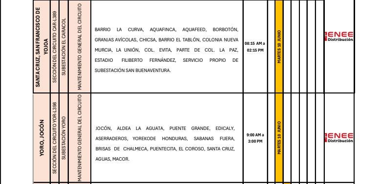 Redacción. Varias zonas de Santa Cruz de Yojoa (Cortés) y Jocón (Yoro) serán afectadas con los cortes de energía programados por la Empresa Nacional de Energía Eléctrica (ENEE) para este martes 10 de junio de 2025.