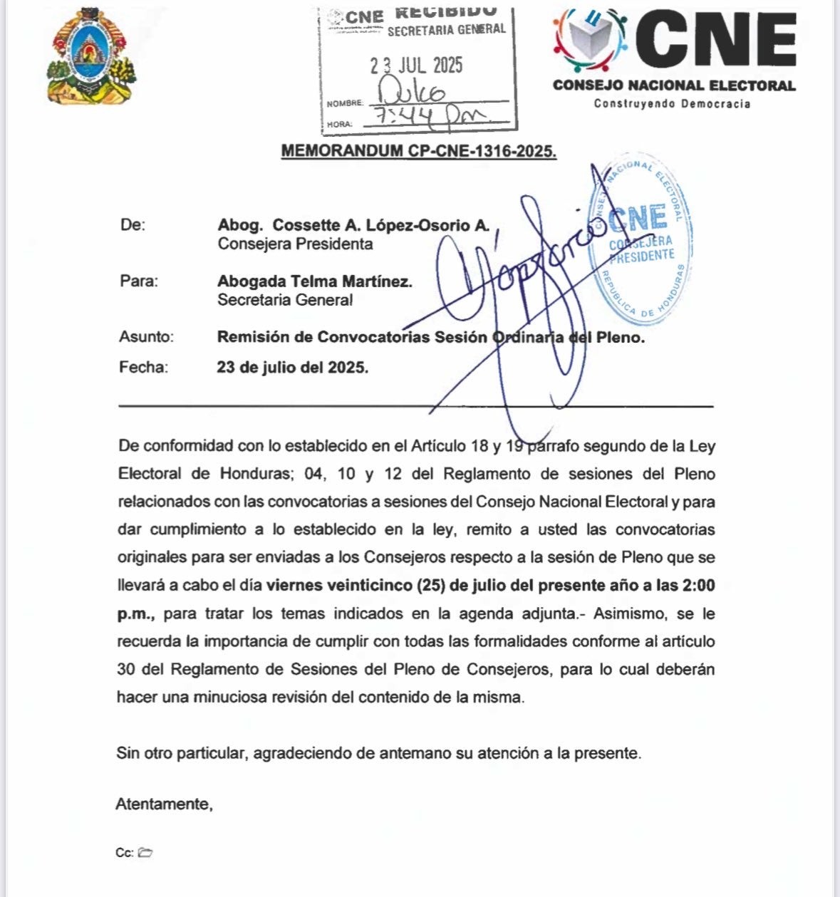 Cossette López reiteró que su obligación legal es convocar al pleno del CNE, especialmente durante periodo electoral, en el que el ente debe sesionar al menos una vez por semana. Este viernes, convocó formalmente a sus compañeros Ana Paola Hall y Marlon Ochoa para abordar una agenda que incluye puntos urgentes como la suscripción del convenio de observación electoral con la Unión Europea.