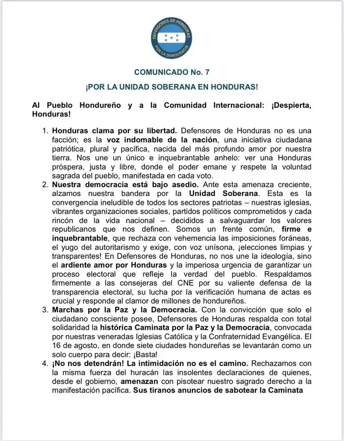 Redacción. La organización Defensores de Honduras por la Democracia convocó al pueblo hondureño a una marcha nacional, describiéndola como una iniciativa ciudadana «patriótica, plural y pacífica».