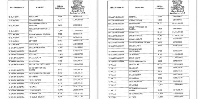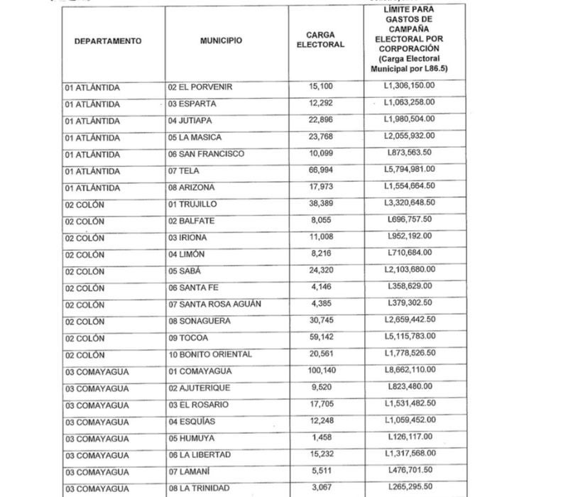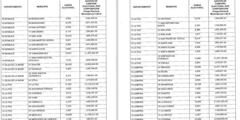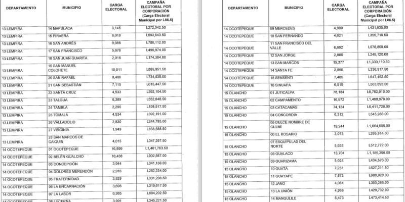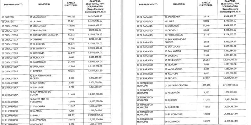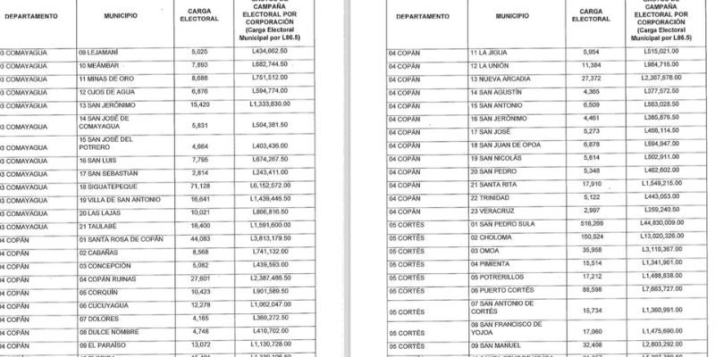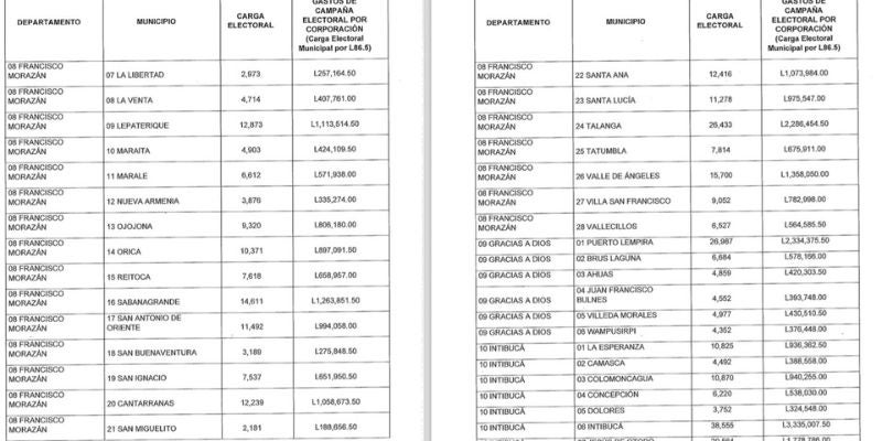 Nivel presidencial y designados: se toma el total de ciudadanos registrados en el Censo Nacional Electoral (5,879,639) y se multiplica por el doble del costo por voto (L 86.50).