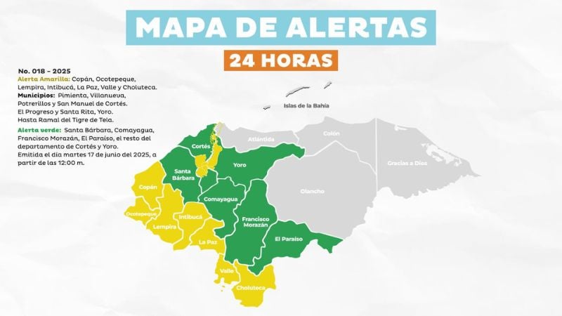 Las autoridades de Copeco señalaron que se mantendrán en alerta verde los departamentos de Santa Bárbara, Comayagua, Francisco Morazán, El Paraíso y el resto de los departamentos de Cortés y Yoro.