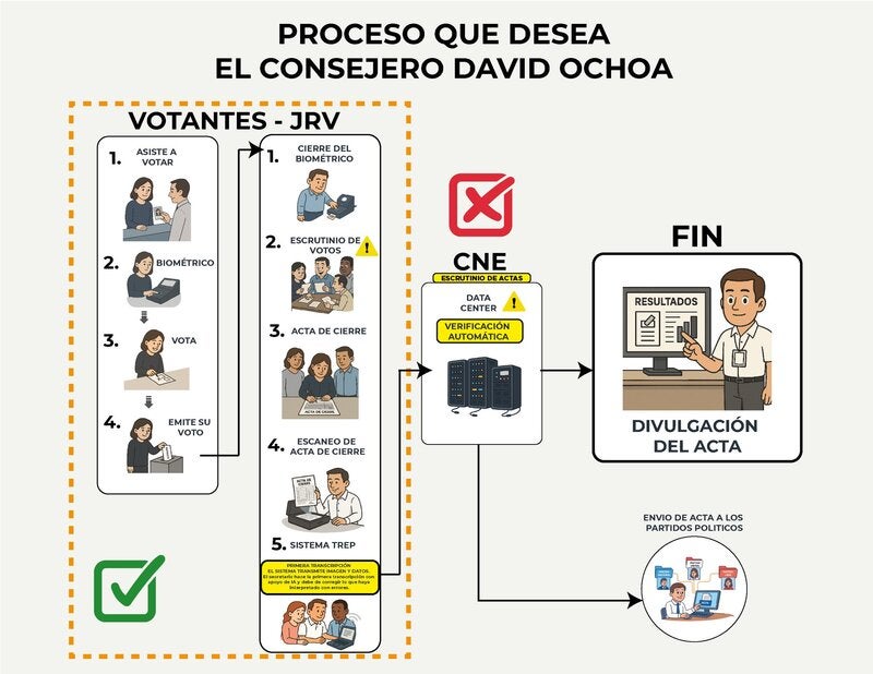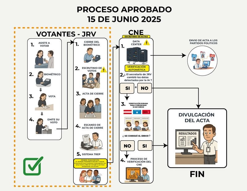 Es importante recordar que, en una sesión de pleno con votación de dos a uno, el 15 de junio los consejeros aprobaron los pliegos de condiciones para adjudicar el sistema de Transmisión de Resultados Electorales Preliminares (TREP), así como un nuevo modelo que consiste en la verificación de las actas transmitidas desde las Juntas Receptoras de Votos (JRV).