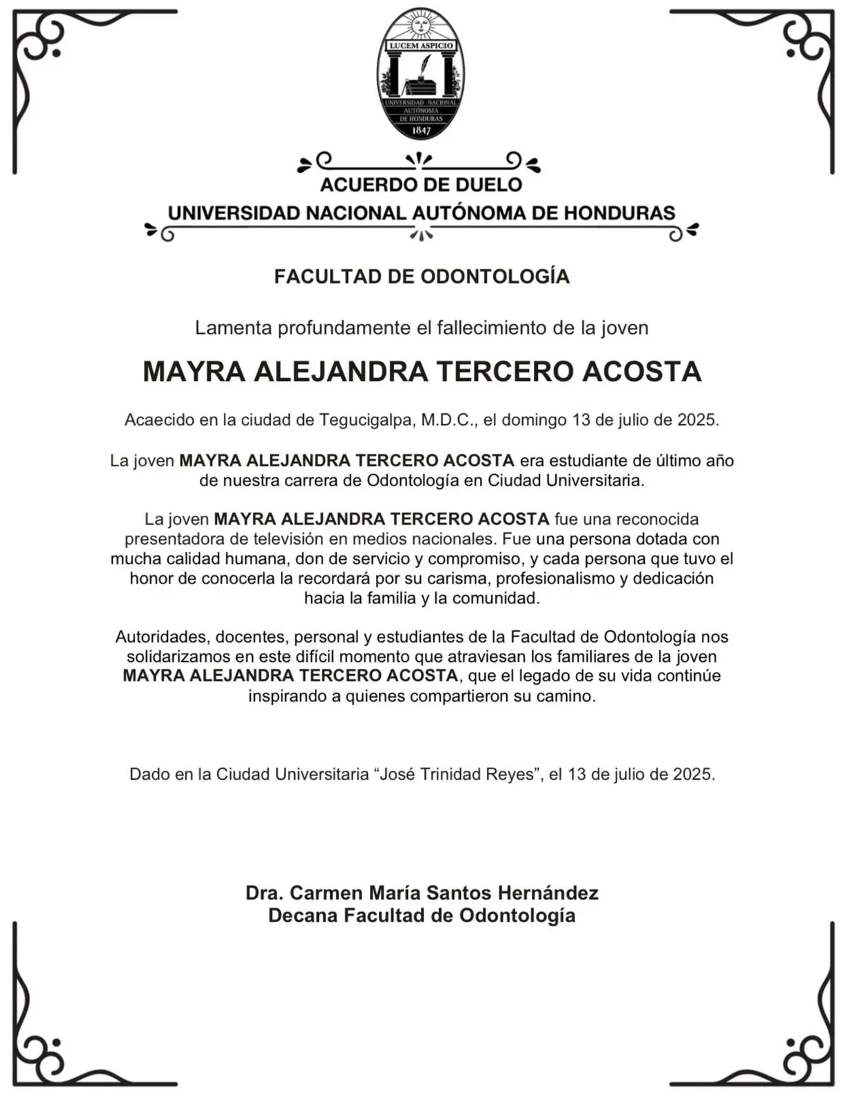 «Hoy, la Facultad de Odontología se despide con profundo pesar de una de sus estudiantes, Mayra Alejandra Tercero Acosta, una joven que se distinguió por su amabilidad, alegría constante y esa luz que irradiaba a quienes la rodeaban», indicaron.