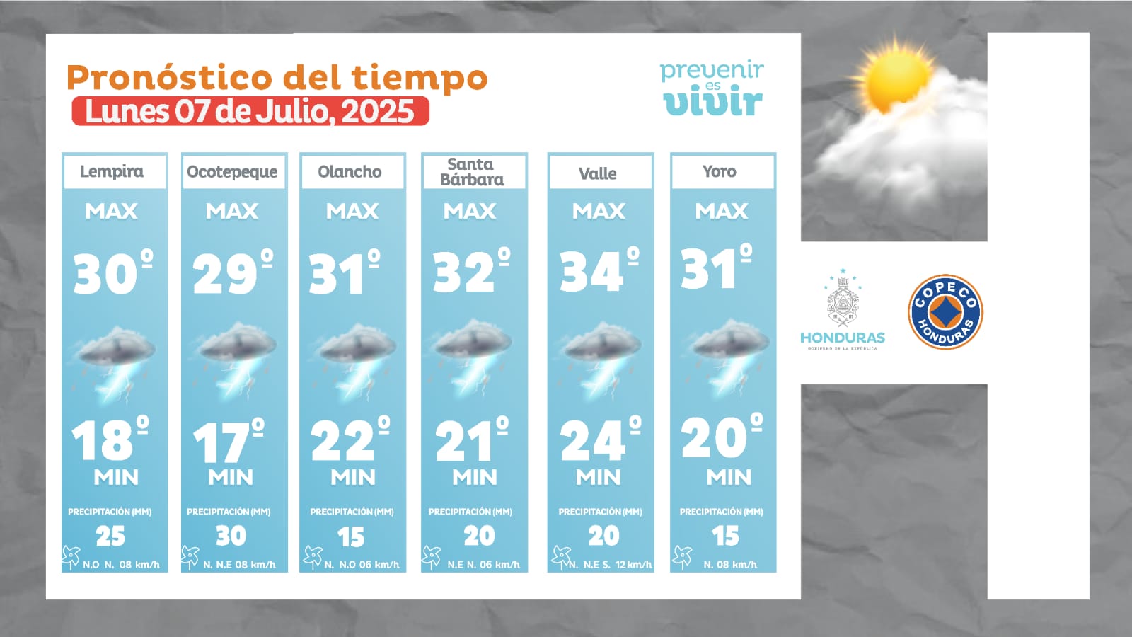 - Choluteca: 34° como máximo, 24° como mínima (0 milímetros).