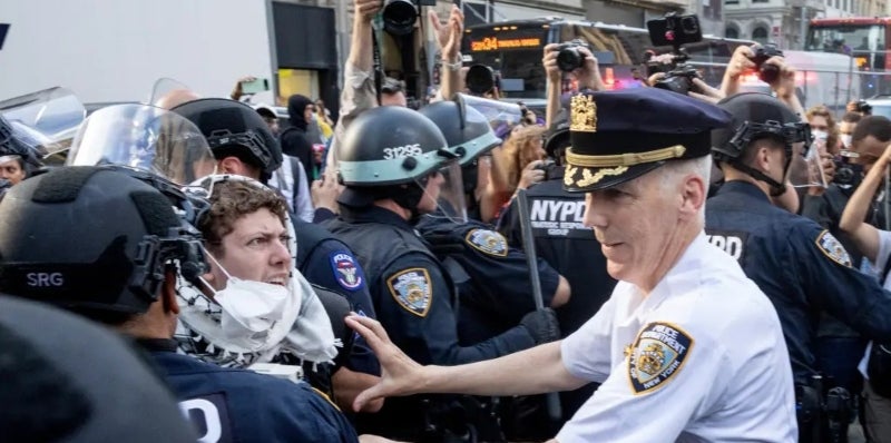 Algunos manifestantes lanzaron botellas de agua y otros objetos a los agentes de policía, según fuentes policiales y videos. Otros corearon «¡Vergüenza! ¡Vergüenza!» mientras la policía de Nueva York detenía a manifestantes enmascarados, según muestra un video.