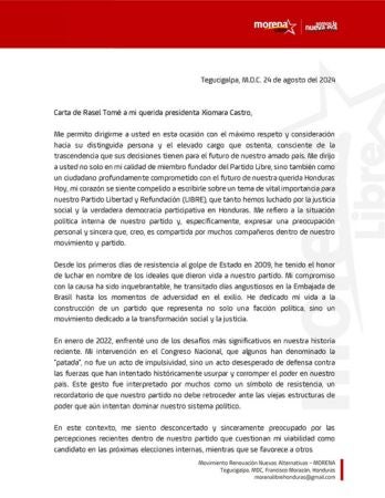 “Hoy, mi corazón se siente compelido a escribirle sobre un tema de vital importancia para nuestro partido (…) Me refiero a la situación política interna de nuestro partido y, específicamente, expresar una preocupación personal y sincera que, creo, es compartida por muchos compañeros dentro de nuestro movimiento y partido”, cita el escrito.