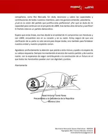 «¿Cuál es la visión del partido que justifica la preferencia hacia ella? ¿Por qué se duda de mi capacidad para continuar con el proyecto de Libre, tras tantos de años de lucha y sacrifico? El Partido Libre es un partido democrático», aseveró.