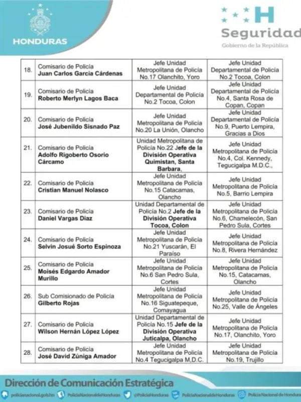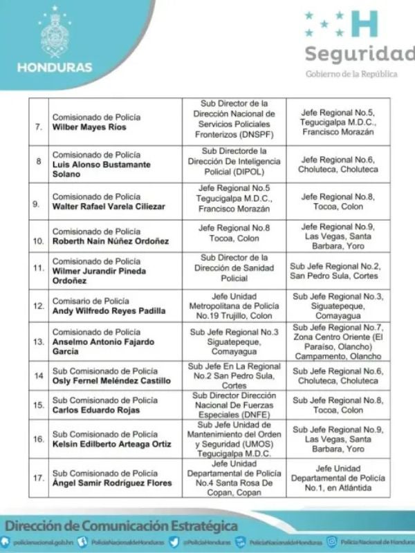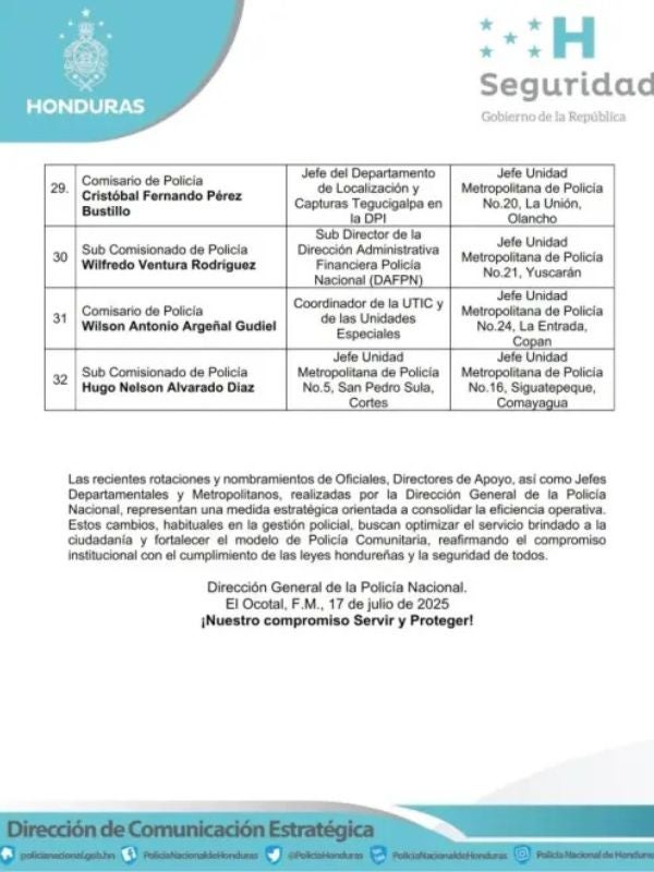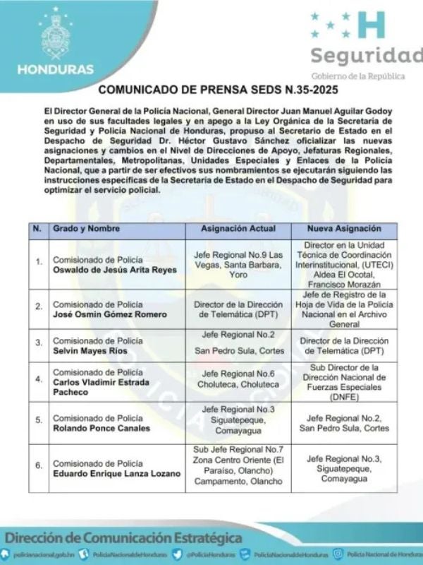 Redacción. La Secretaría de Seguridad de Honduras anunció este miércoles una reestructuración interna en la Policía Nacional, con un total de 60 movimientos de oficiales a nivel nacional, como parte de una estrategia de relevo generacional y fortalecimiento institucional, impulsada por el alto mando policial.