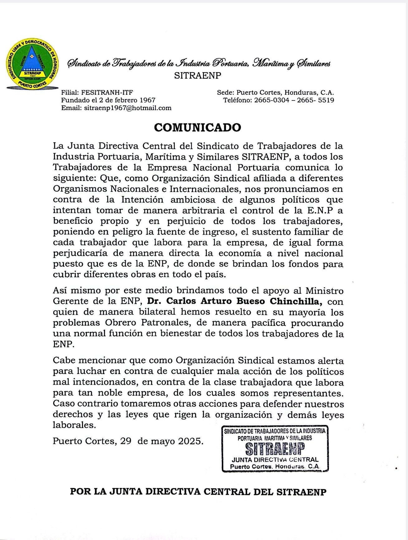Redacción. El Sindicato de Trabajadores de la Industria Portuaria, Marítima y Similares (SITRAENP) denunció este jueves un intento de control político dentro de la Empresa Nacional Portuaria (ENP), una institución clave para la economía de Honduras.