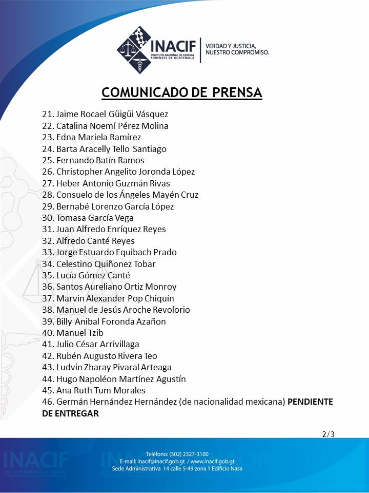 Luego de que se rescataron los cuerpos del barranco, se procedió a trasladarlos a un sitio habilitado por el INACIF, para su identificación. Una vez realizado el proceso que demanda la ley de Guatemala, se han ido entregando los cuerpos a los familiares para su velorio y cristiana sepultura.