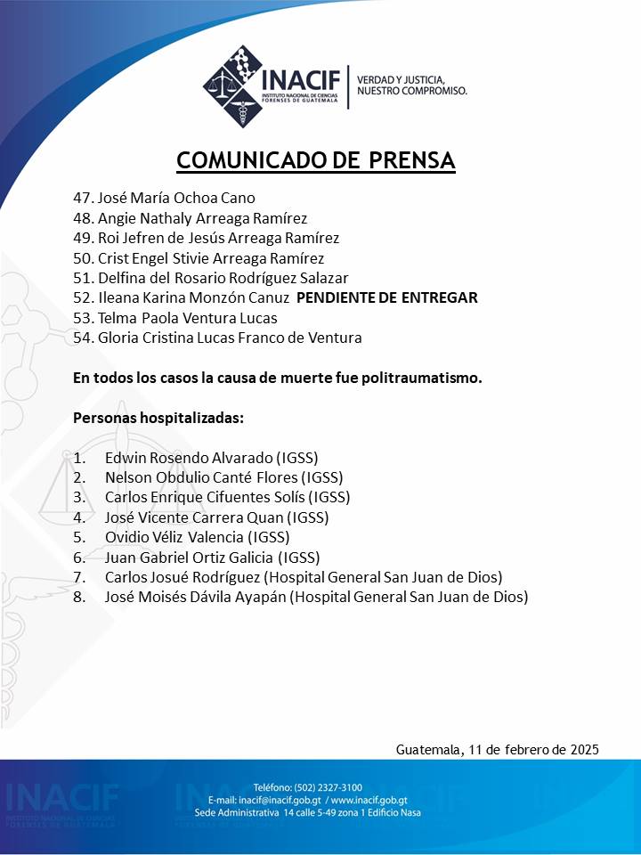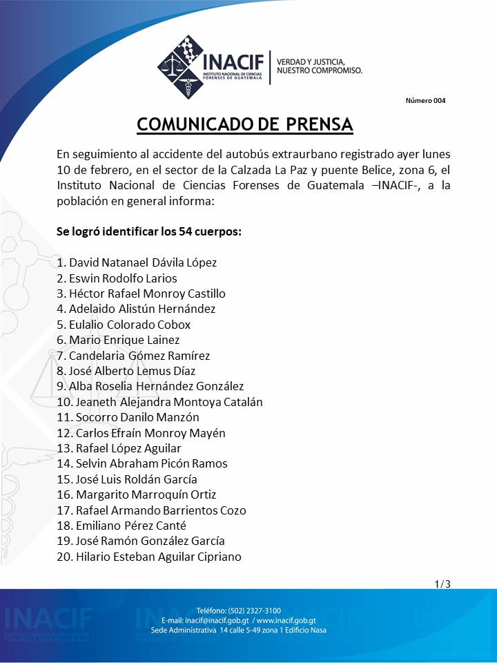 Redacción. El Instituto Nacional de Ciencias Forenses de Guatemala (INACIF) informó, a través de un comunicado, que asciende a 54 la cifra de personas muertas tras el accidente del autobús extraurbano que se registró ayer, lunes 10 de febrero.