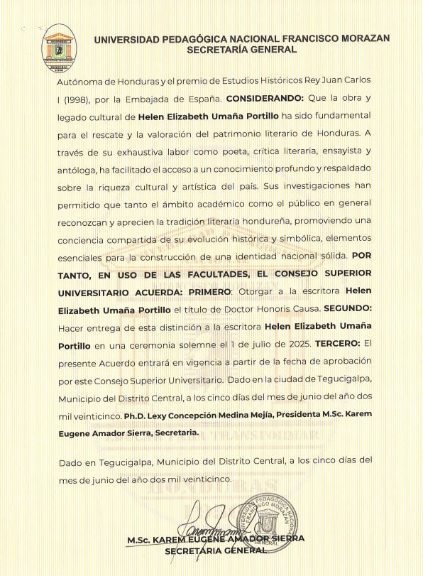 La UPNFM ha subrayado en su resolución que las obras de Helen Umaña no solo enriquecen la cultura literaria nacional, sino que han sido decisiva en la preservación, estudio y puesta en valor del patrimonio cultural hondureño.