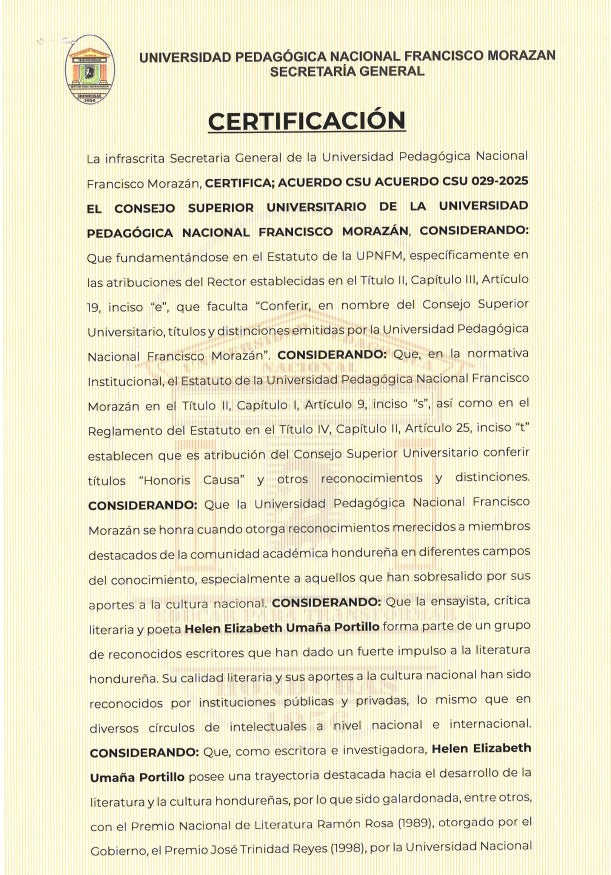 Redacción. En un gesto de alto reconocimiento a una vida consagrada al pensamiento, la creación literaria y la investigación cultural, la Universidad Pedagógica Nacional Francisco Morazán (UPNFM) ha decidido otorgar el título de Doctor «Honoris Causa» a la destacada escritora, crítica literaria y ensayista Helen Elizabeth Umaña Portillo, figura imprescindible en la consolidación de la literatura hondureña contemporánea.